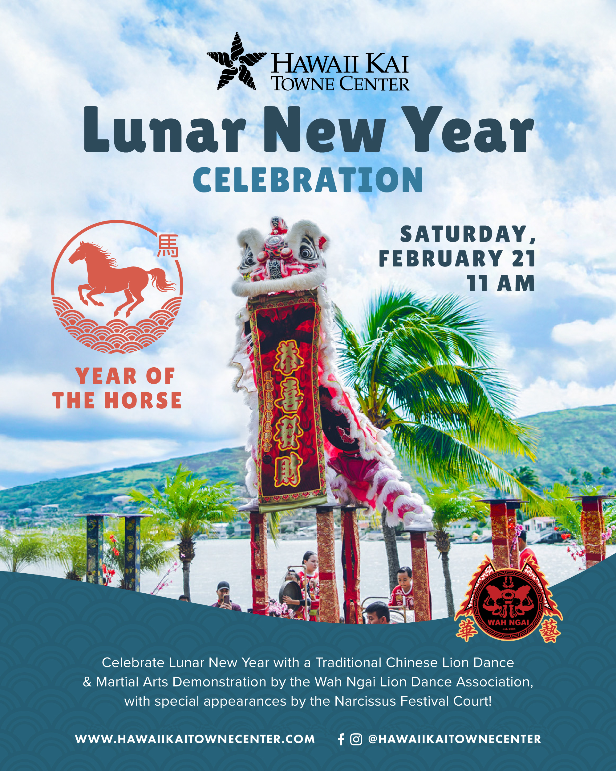 Celebrate the Year of the Fire Horse at Hawaii Kai Towne Center’s free, all-ages Lunar New Year Celebration on Saturday, February 21, 2026, from 11 a.m. to 1 p.m. Join us at the Marina Docks Stage and Courtyard for a lively martial arts demonstration, a traditional Chinese lion dance by the Wah Ngai Lion Dance Association, and special appearances by the Narcissus Festival Court. This festive, family-friendly celebration welcomes the new year with culture, energy, and good fortune for everyone!